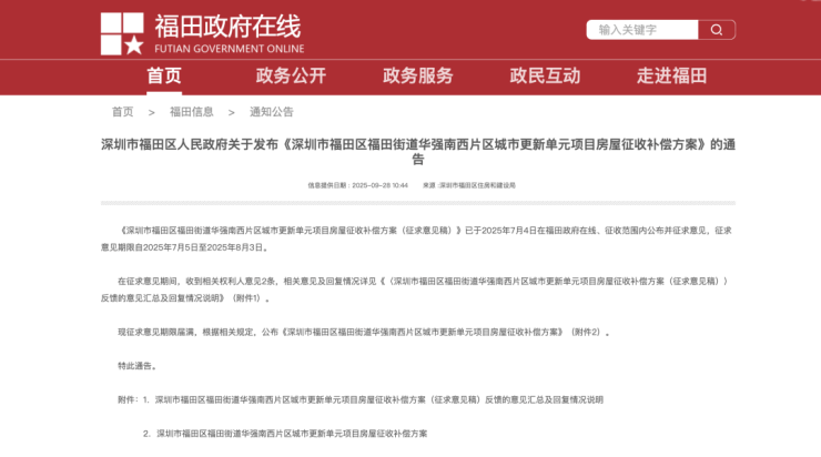 2023年9月,福田区人民政府指定福田街道办事处作为该城市更新单元的行政调解实施机关,启动行政调解工作。