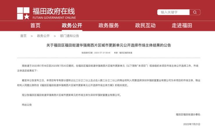 公开信息显示,2023年6月,该项目完成《搬迁补偿指导方案》和《公开选择市场主体方案》表决,7月份福田街道办事处发布公告确定华强南西片区城市更新单元的市场主体为深圳华强财富置业有限公司。