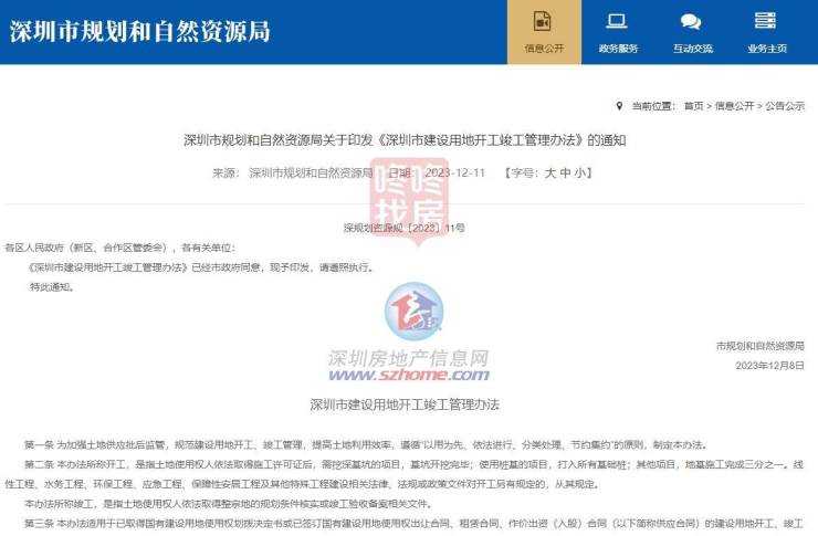 12月11日,深圳市规划和自然资源局印发《深圳市建设用地开工竣工管理办法》的通知。