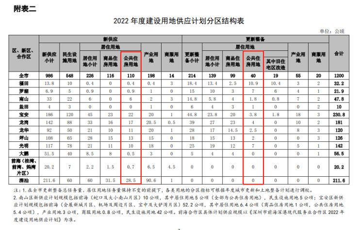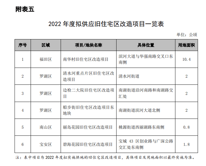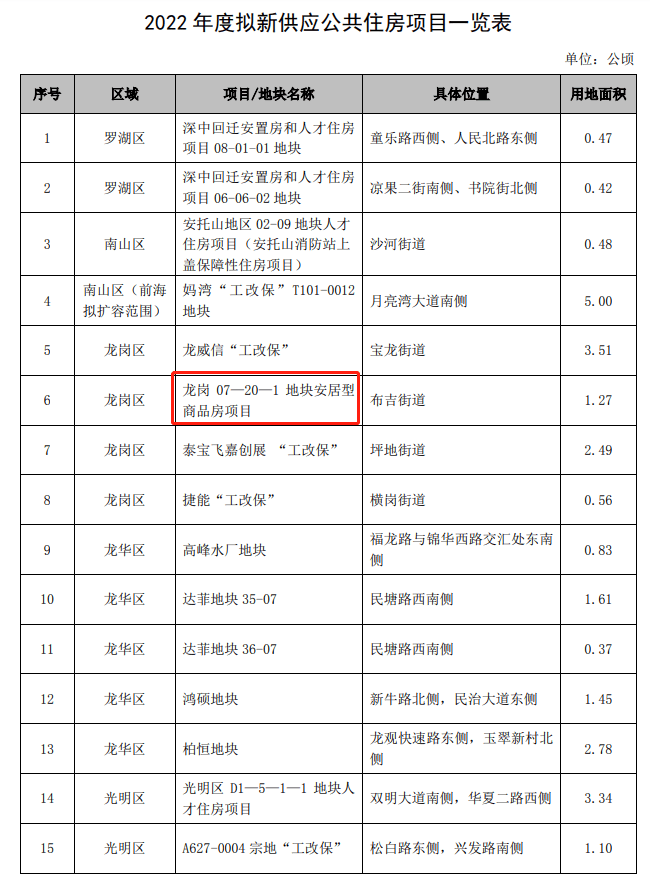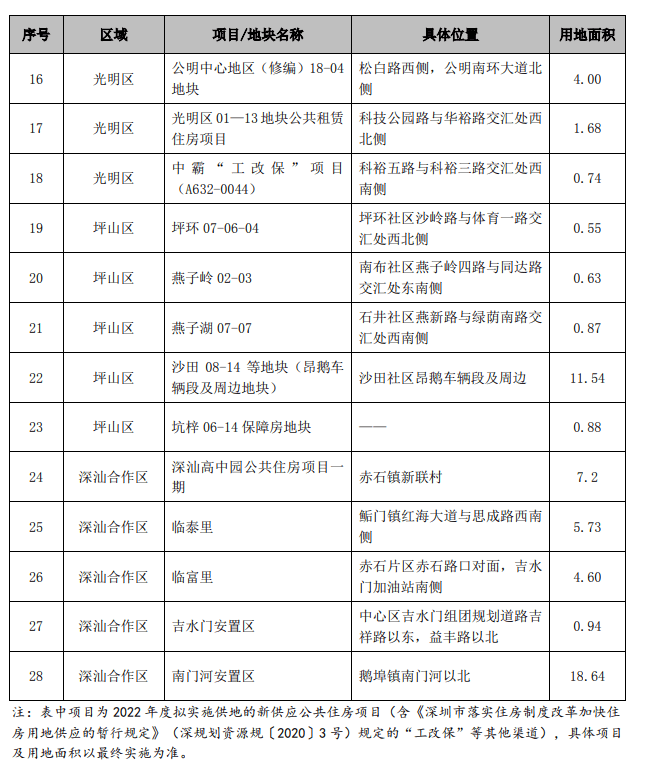 注:表中项目为2022年度拟实施供地的新供应公共住房项目(含《深圳市落实住房制度改革加快住房用地供应的暂行规定》(深规划资源规〔2020〕3号)规定的“工改保”等其他渠道),具体项目及用地面积以最终实施为准。