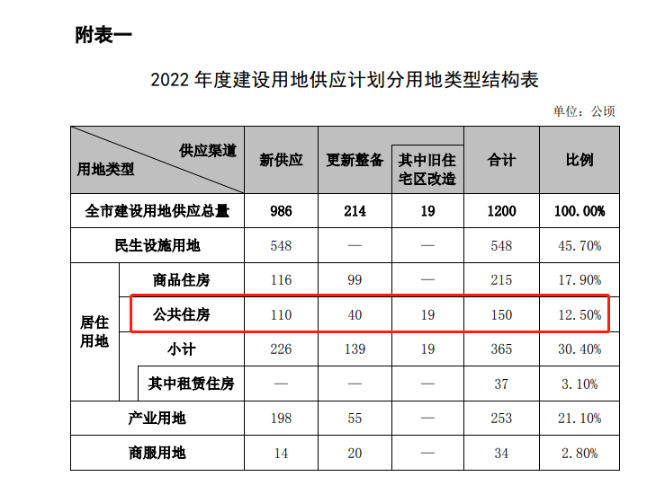 2022年度全市(含深汕)计划供应建设用地1200公顷,其中新供应建设用地986公顷,更新整备供应建设用地214公顷(含旧住宅区改造供应居住用地19公顷)。