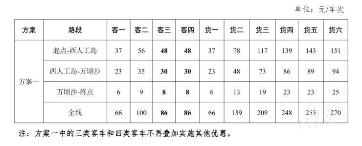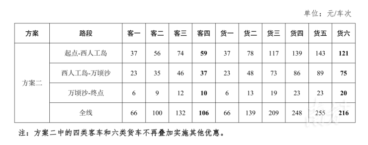 在前期政策及替代运输方式收费标准研究、成本监审和实地调查的基础上,结合各方意见,定价机关拟定了以下两套深中通道车辆通行费收费标准听证方案,以供听证。