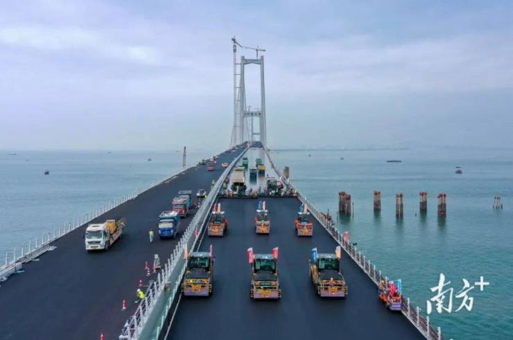 △1月11日,深中通道正在进行伶仃洋大桥东泄洪区右幅沥青摊铺施工。