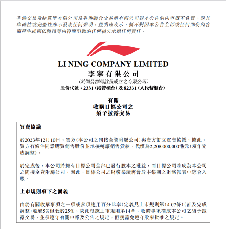 李宁12月10日在港交所公告,李宁将以22.08亿港元从恒基兆业购买物业。买方(公司之间接全资附属公司)与卖方订立买卖协议,据此,买方有条件同意购买销售股份并承接转让销售贷款,代价为22.08亿港元(须作完成调整)。于完成后,公司将拥有目标公司全部已发行股本之权益,而目标公司将成为公司之间接全资附属公司,因此,目标公司之财务业绩将会于集团之财务报表中综合入账。