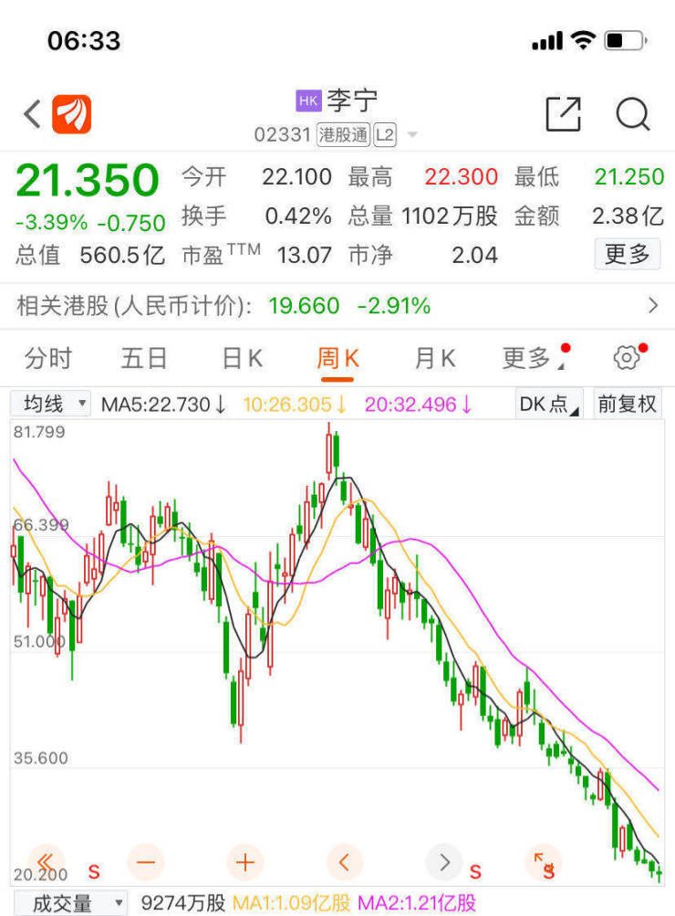 在二级市场层面,李宁的股价变现并不尽如人意。截至最新收盘,李宁股价报21.35港元,年内累计跌幅达68%,总市值缩水至560.6亿港元,仅为安踏总市值的25%。