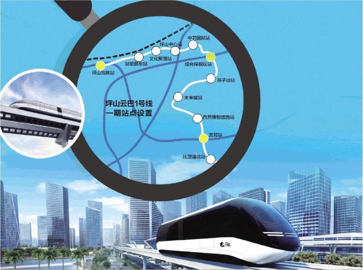 深圳坪山云巴1号线一期工程线路起于坪山高铁站,终于比亚迪北站,全长8.506公里,采用高架敷设方式,共设11座车站,分别为坪山高铁站、站前路东站、文化聚落站、坪山中心站、中芯国际站、综合保税区站、燕子岭站、未来城站、自然博物馆西站、龙背站、比亚迪北站。
