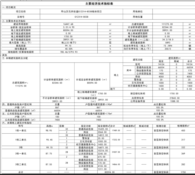 根据规划,项目总用地面积7.62万㎡,其中建设用地面积4.9万㎡,道路用地面积2.72万㎡,住宅建面约21.2万㎡,商业建面约1.2万㎡。项目总户数2833户,包括商品房住宅1740户、自持保障性住宅806户、移交保障房287户。