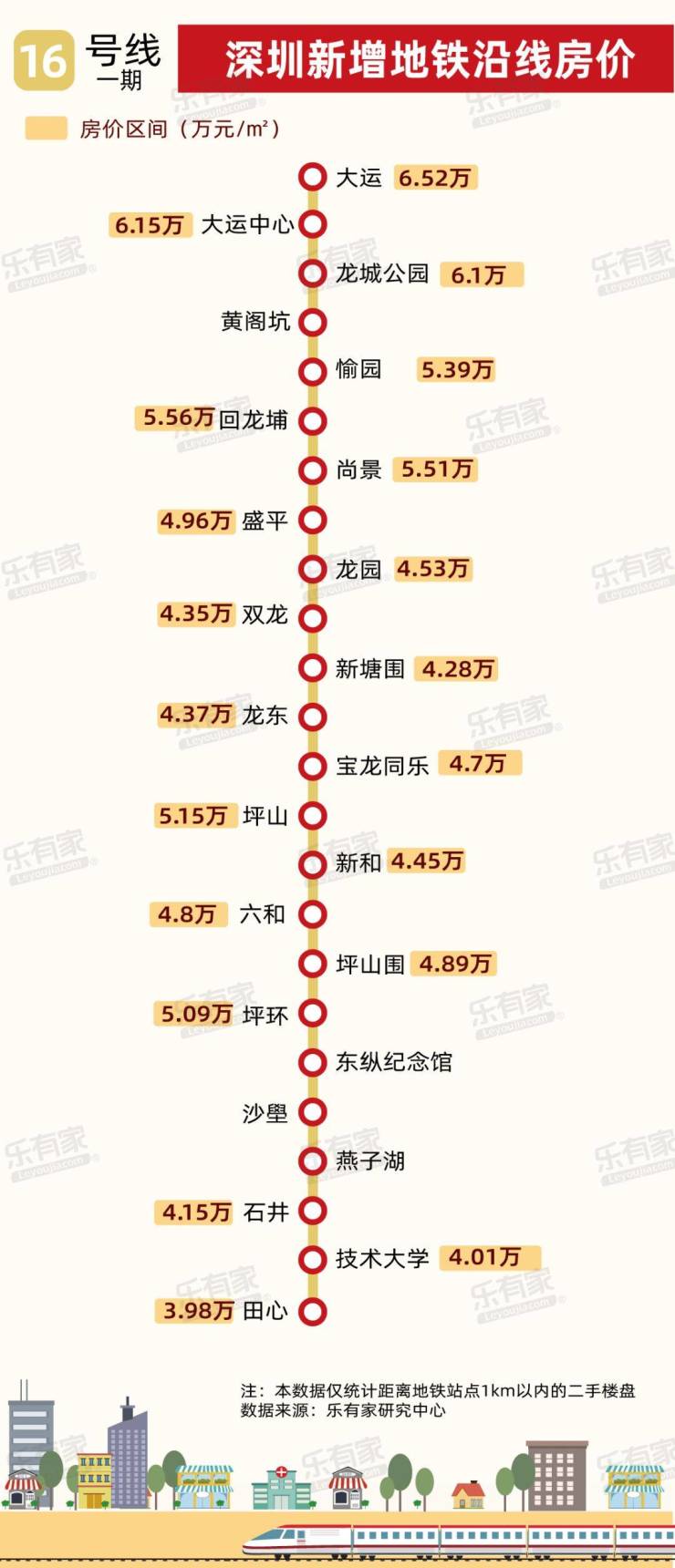 首先,来看看二手房房价方面,据乐有家研究中心在8月份统计的地铁16号线沿线二手房房价大致如下,其中大运、大运中心及龙城一带二手房价格超过5万。如今时隔4个月,想必目前的价格只会在以下统计价格内更便宜,大家也可以以此参考去看(砍)看(价)。
