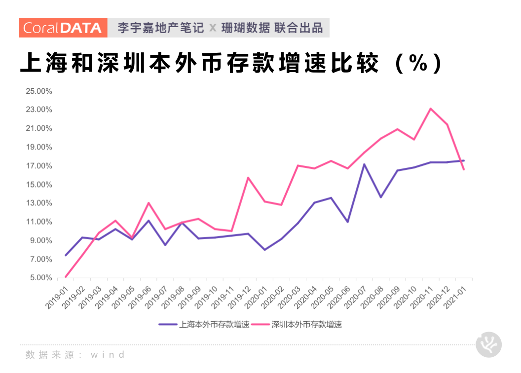 我们拿深圳和作为国际金融中心的上海比较,据珊瑚数据统计,2015年,深圳本外币存款余额只有上海的50%,2020年达到65%,并突破10万亿;2015年,深圳人均本外币存款53万元,2019年75.8万元,同比增长43%。