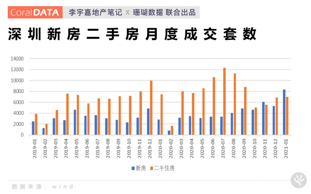 从新房和二手房月度成交数据看,2020年下半年以后,相比较二手房市场,新房市场无限好,超越任何时候,这要拜一二手房价格“倒挂”、“打新”热潮所赐。新房的价格一直控制在5-6万元,而二手房价早已涨到了7-8万元,据说2021年的1月份,二手房价格超过9万元了。