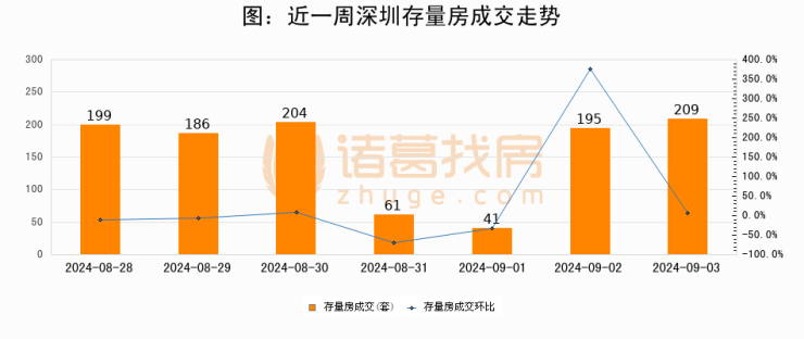 从存量房来看,2024年09月03日深圳存量房单日成交209套,比昨日增加14套,环比上涨7.2%。从近一周存量房成交来看,深圳存量房日均成交套数为156套,09月03日单日成交209套,高于近一周平均水平34%。