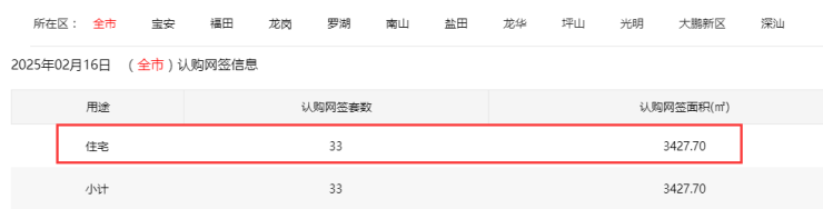 2025年2月16日新房住宅认购网签33套。其中,宝安9套;福田5套;龙岗4套;罗湖0套;南山0套;盐田0套;龙华11套;坪山0套;光明4套;大鹏0套;深汕0套。