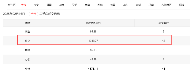 2025年2月16日二手房住宅网签42套。其中,宝安4套;福田10套;龙岗15套;罗湖4套;南山2套;盐田0套;龙华4套;坪山3套;光明0套;大鹏0套。