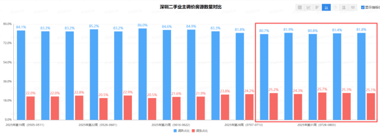 据乐有家研究中心统计,7月中下旬以来,深圳调涨房源成交占比连续5周维持在25%左右。