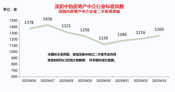 据深房中协统计,深圳二手录得量出现了三连涨,最近一周(33周)的录得量是1265套,对比32周的1216套,上涨了4%。