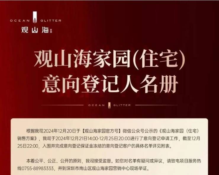 12月26日,前海新盘观山海家园(住宅)意向登记人名册公示,共登记347批客户,人筹比1.34:1。12月27日10:00,项目将进行选房顺序号公证摇号,项目计划12月28日选房。