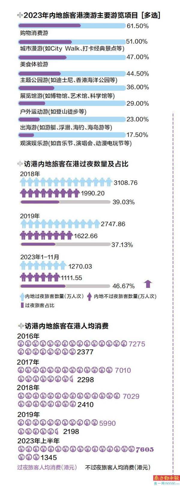 根据香港旅发局最新统计数据,从2023年全年来看,有超2650万人次访港旅客来自内地,另据澳门特区政府网站消息,2023年入境澳门旅客约2823万人次,日均7.7万人次。