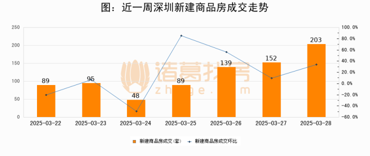 根据深圳市住房和城乡建设局数据显示,2025年03月28日深圳新建商品房成交203套,较昨日增加51套,环比上涨33.6%