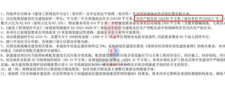 值得注意的是,在规划许可证备注中显示,该宗地规划建设住宅建筑面积(单位:平方米)中含普通商品住宅 218138 平方米、共有产权住房 125336 平方米(深共有任书[2022]1 号)。