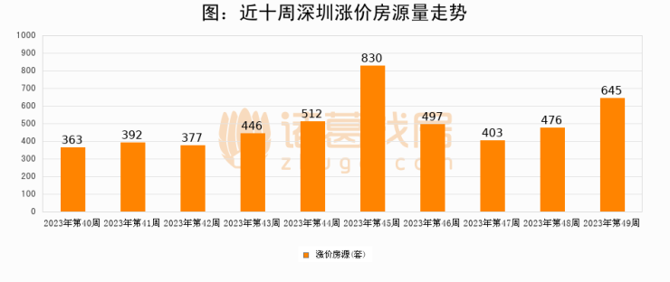 从调价房源来看,第49周深圳涨价房源645套,较上周上涨35.5%。与此同时,49周涨价房源占比回落1.82个百分点,业主信心小幅波动,购房者可则需入市。