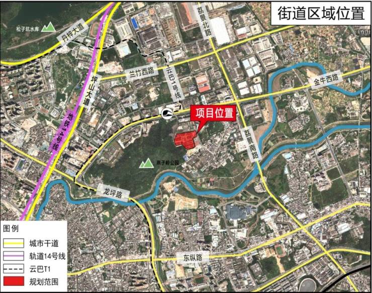项目位于坪山区龙田街道,东邻形胜路,西靠燕子岭公园,北邻大潮路。