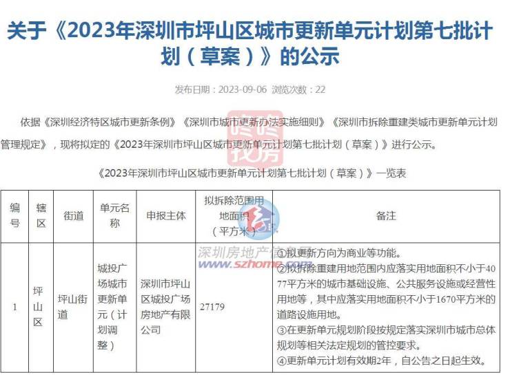 2023年9月,项目拟列入《2023年深圳市坪山区城市更新单元计划第七批计划(草案)》更新计划。