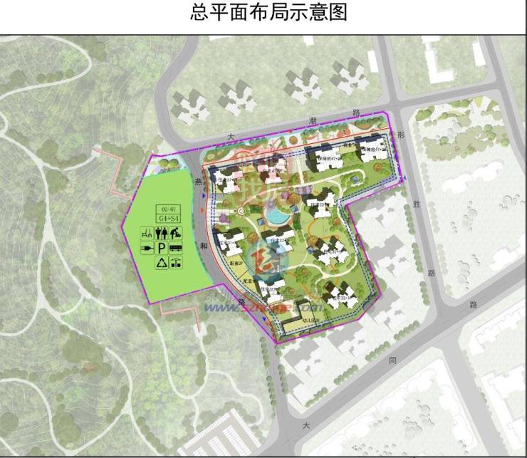 据总平面布局图显示 ,规划将规划8栋高层住宅、2栋47层高保障房,一所幼儿园。项目边上还有块广场+交通场站用地。