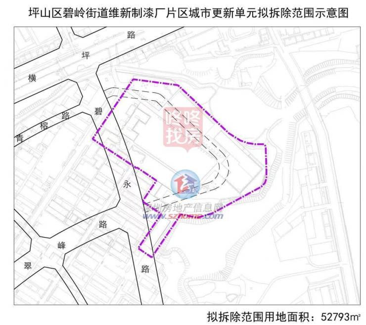 维新制漆厂片区城市更新单元位于碧岭街道,申报主体为维新制漆(深圳)有限公司,拟拆除范围用地面积52793平方米。