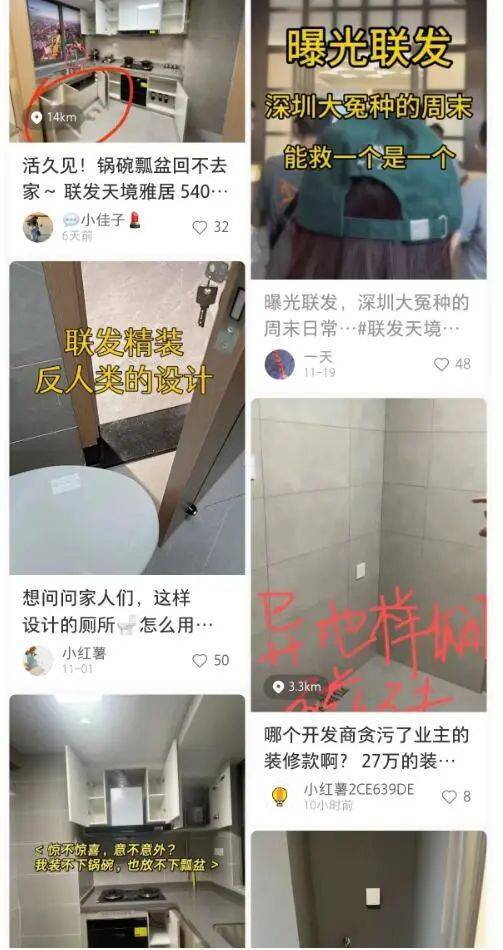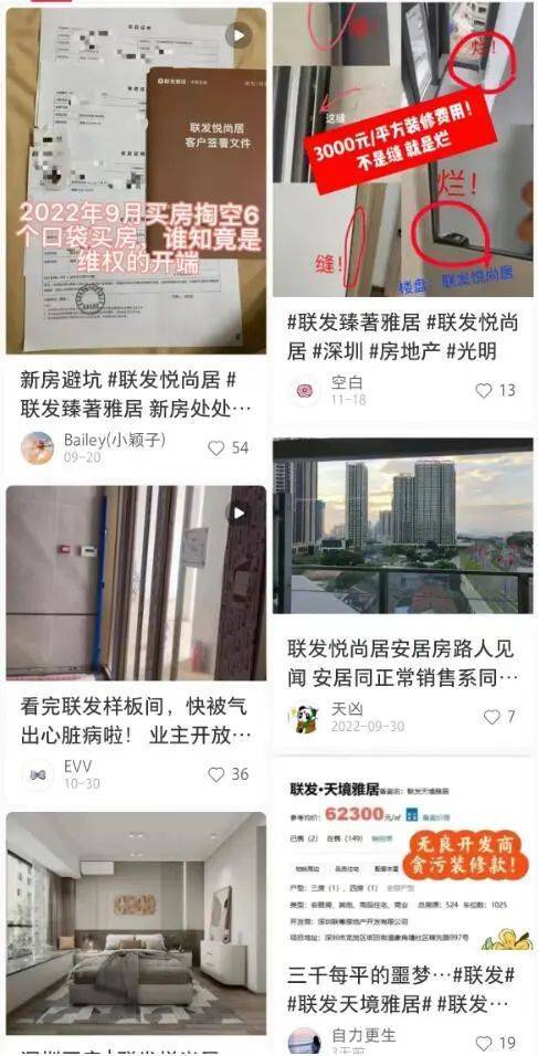 在小某书上,联发地产在深圳开发的前两个项目光明联发悦尚居、坂田的天境雅居的业主,分别对所在项目装修用材、质量等问题提出了质疑,在一定程度上影响了开发商市场口碑及公信力。