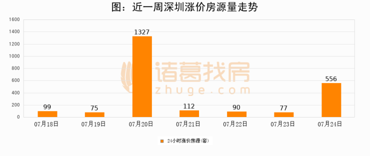 根据诸葛找房数据显示,深圳24小时涨价房源量为556套,较07月23日增加479套,环比上涨622.1%。与此同时,涨价房源占比小幅扩大,业主信心有所提升。