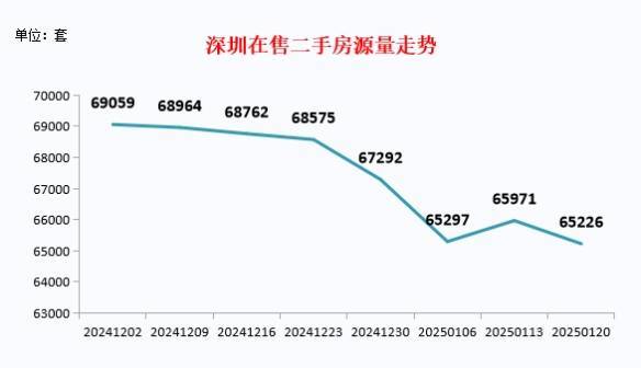 根据公开在售二手房源量数据统计,2025年1月20日,全市共有65,226套有效二手房源在售,较上周减少745套。其中龙岗较上周减少274套,有效在售17,285套,罗湖较上周减少171套,有效在售8,635套,福田较上周减少143套,有效在售9,394套。