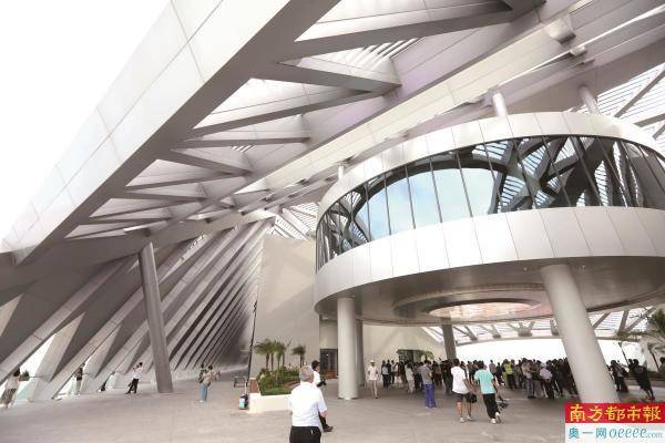 跟车驶出隧道后,便抵达桥梁隧道交通转换的重要枢纽——造型如鲲鹏展翅的西人工岛。站在西人工岛中庭广场向西远眺,即是若游龙飞动的桥梁和高塔耸入云端的深中大桥,向东望去深圳前海、宝安机场尽收眼底,每隔一分钟便有一架飞机起降。