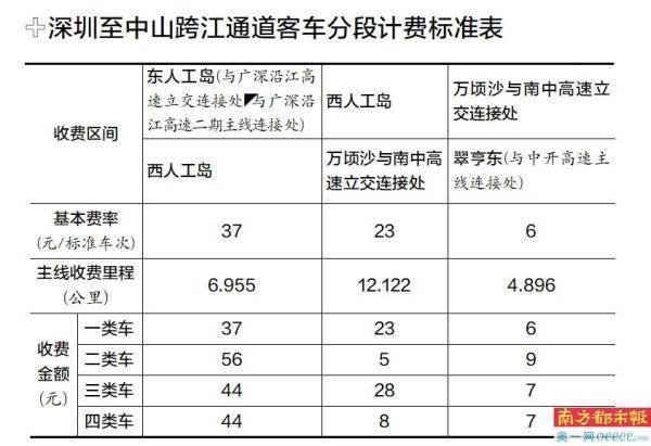 其中,东人工岛(起点)至西人工岛的收费标准为37元/标准车次、西人工岛至万顷沙枢纽互通的收费标准为23元/标准车次、万顷沙枢纽互通至横门互通(终点)的收费标准为6元/标准车次;1至4类客车的收费系数分别为1、1.5、2、3,其中3类客车、4类客车收费系数按前述系数的60%执行;1至6类货车的收费系数分别为1、2.1、3.16、3.75、3.86、4.09,专项作业车的收费标准参照货车执行。