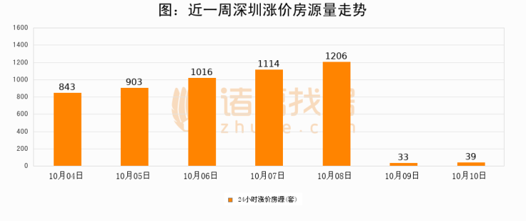 根据诸葛找房数据显示,深圳24小时涨价房源量为39套,较10月09日增加6套,环比上涨18.2%。与此同时,涨价房源占比小幅扩大,业主信心有所提升。