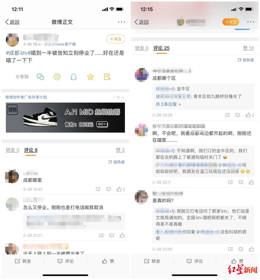 此前KTV开业红星新闻记者还致电了锦江区吸引力ATT KTV(东大店)、美乐迪等成都多家KTV,他们均表示昨日已经接到文旅部门要求暂停营业的通知,今日已完全停止营业。记者在某电商平台也看到,多家KTV显示今日休息,在预约一览,显示“满房”,已无法预约。同时,在微博中,不少网友也表示经历了此次娱乐场所再次暂停营业。网友@张小五要日天 表示,“唱到一半被告知立刻停业了……好在还是唱了一下下。”还有在金牛区预订了KTV的网友,在去KTV的路上,被通知KTV临时关门。