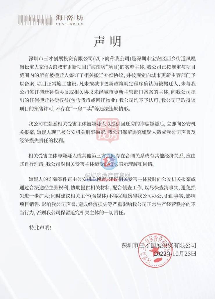 近日,宝安新盘海峦坊官方公众号发布《关于海峦坊项目回迁房相关不实言论的严正声明》。