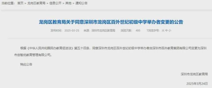 3月25日,龙岗教育局公告了深圳市龙岗区百外世纪初级中学的举办者已由深圳市百外教育集团有限公司变更为深圳市创智优教育管理有限公司。