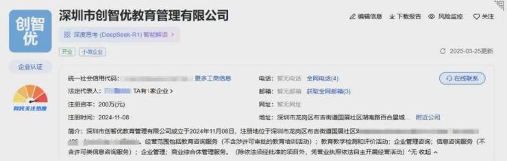 公开信息显示,该校新举办者深圳市创智优教育管理有限公司,成立于2024年11月08日。