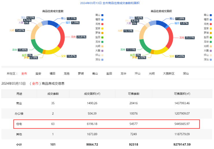 2024年3月13日新房住宅共网签63套。宝安10套;福田1套;龙岗15套;罗湖2套;南山7套;盐田0套;龙华11套;坪山3套;光明10套;大鹏0套;深汕4套。