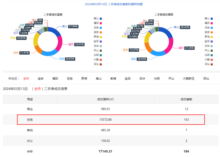2024年3月13日二手房住宅网签163套。宝安18套;福田32套;龙岗33套;罗湖28套;南山29套;盐田2套;龙华13套;光明1套;坪山7套;大鹏0套。