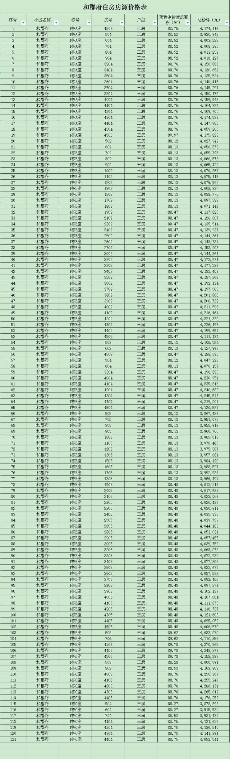 本批房源总价区间约344-372万,具体户型价格如下: