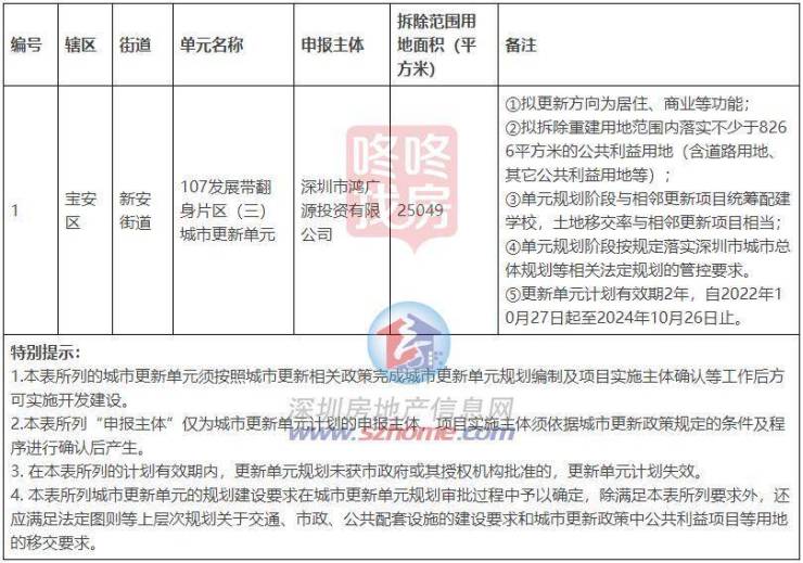 《2022年深圳市宝安区城市更新单元第三批计划》中,仅有一个项目,单元名称107发展带翻身片区(三)城市更新单元,位于宝安区新安街道,申报主体深圳市鸿广源投资有限公司,拆除范围用地面积25049平方米。