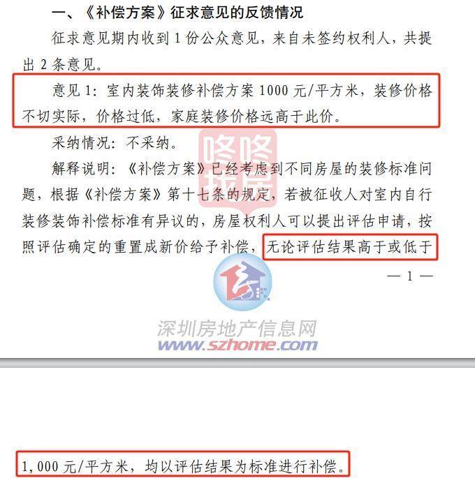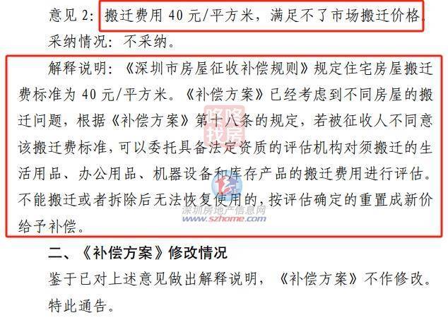 此次片求意思的反馈情况显示,共有1份公众意见,来自未签约权利人,提供2条意见;一条是室内装修1000元/平过低,一条是搬迁费用40元/平,满足不了市场搬迁价格,两条意思均予以不采纳。所以《补偿方案》不作修改。