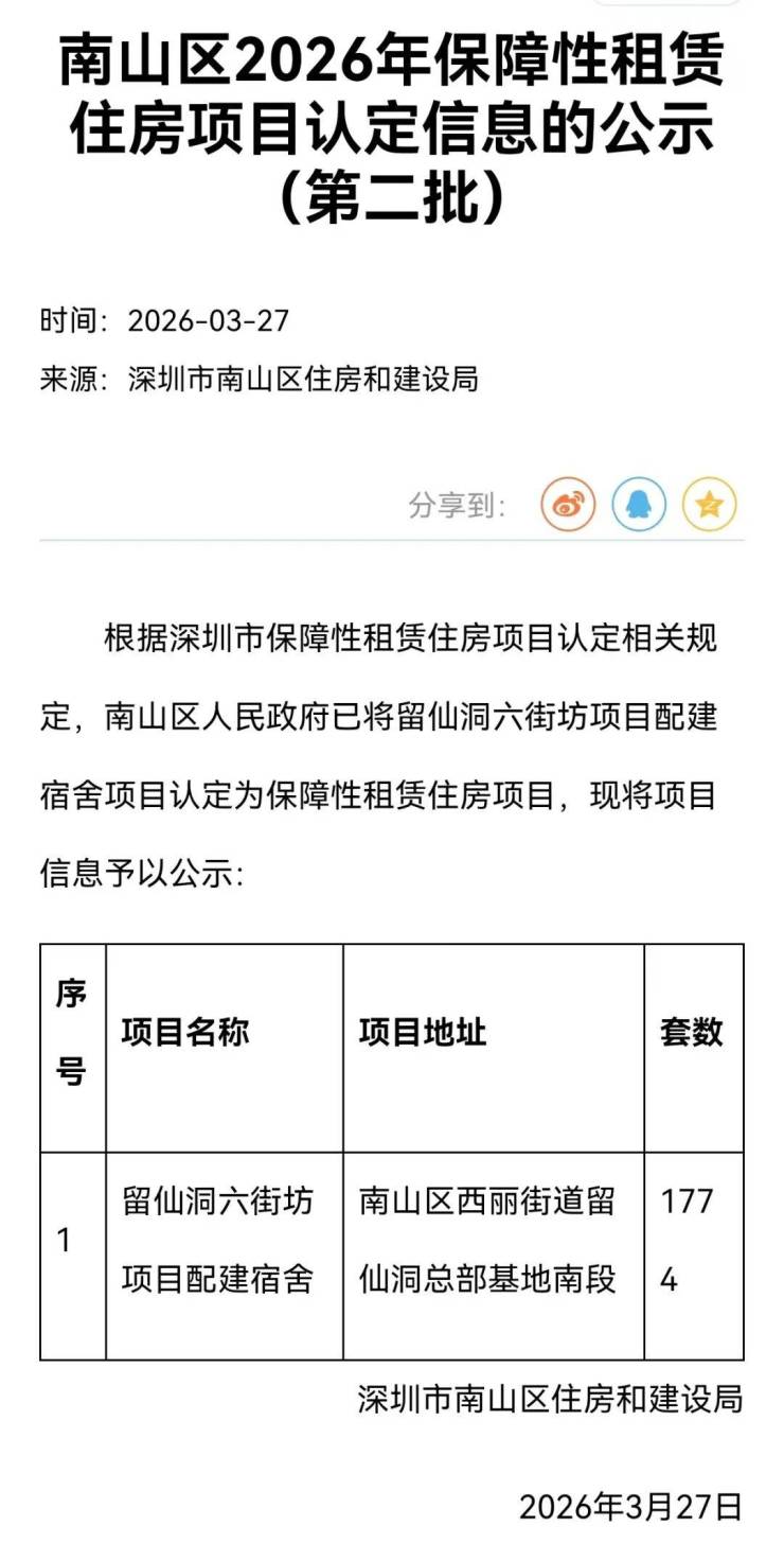 2026年3月27日,第二批公示发布,将留仙洞六街坊项目配建宿舍认定为保障房,该项目位于西丽街道留仙洞总部基地南段,新增房源1774套,持续为创新创业人才提供安居保障。