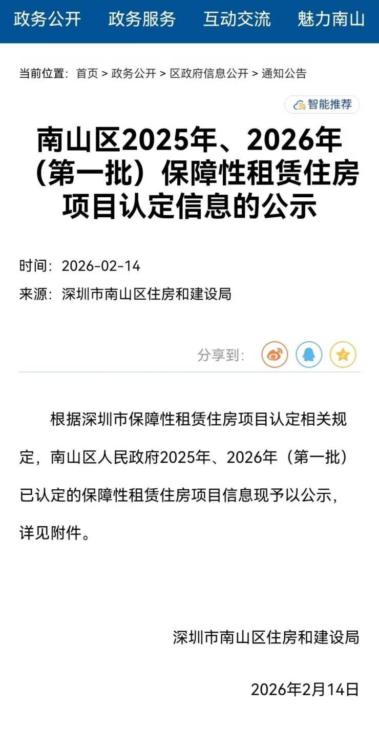 2026年2月14日,南山区住建局发布《南山区2025年、2026年(第一批)保障性租赁住房项目认定信息的公示》,同步公开两个年度首批认定项目。
