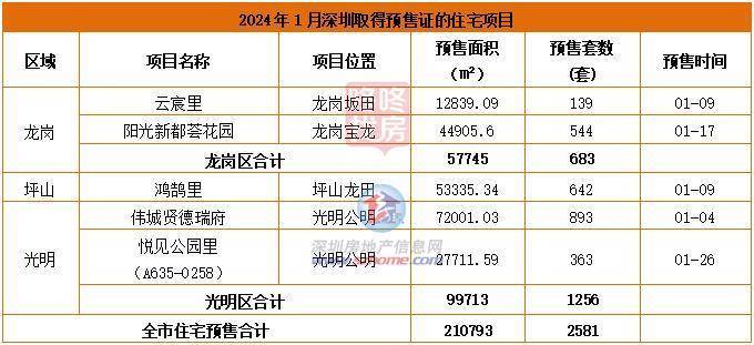 2024年1月深圳5个项目取得住宅预售许可证,预售2581套新房住宅,预售面积210793平方米。其中龙岗区预售683套新房住宅,坪山区预售642套新房住宅,光明区预售1256套新房住宅。