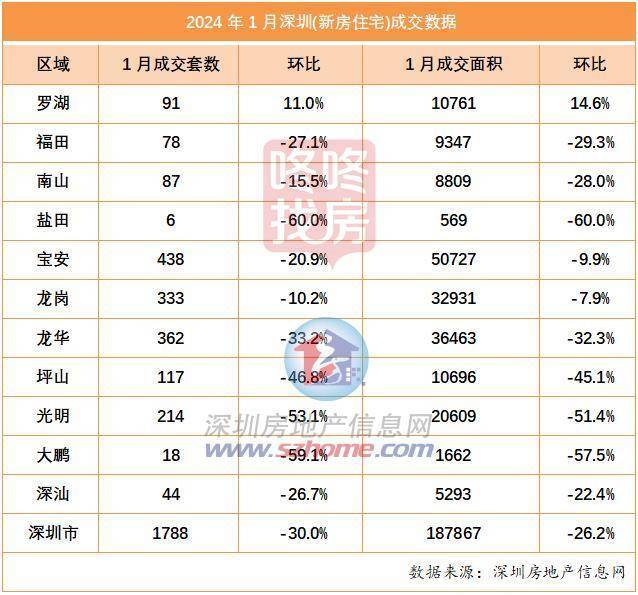 统计数据显示:2024年1月深圳成交1788套新房住宅,环比减少三成;成交面积187867平方米,环比减少26.2%。宝安、龙岗、龙华是全市的主力成交区域。