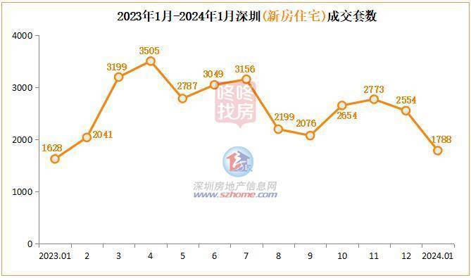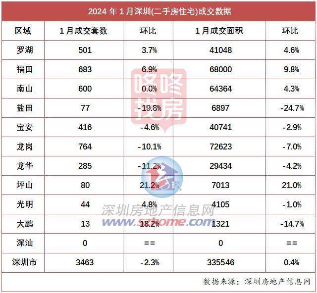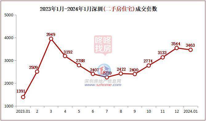 统计数据显示:2024年1月深圳成交3463套二手房住宅,环比减少2.3%;成交面积335546平方米,环比持平。