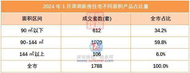 2024年1月深圳成交1788套新房住宅,其中90㎡以下的产品成交612套,占全市总量的34.2%;90-144㎡改善型产品成交1070套,占总量的59.8%;144㎡以上的产品成交106套,占总量的6.0%。