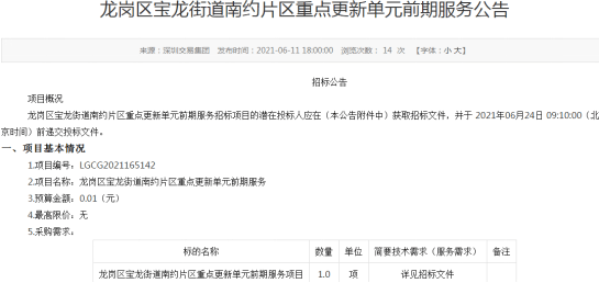 今年6月,宝龙街道南约片区重点更新单元发布前期服务招标公告。
